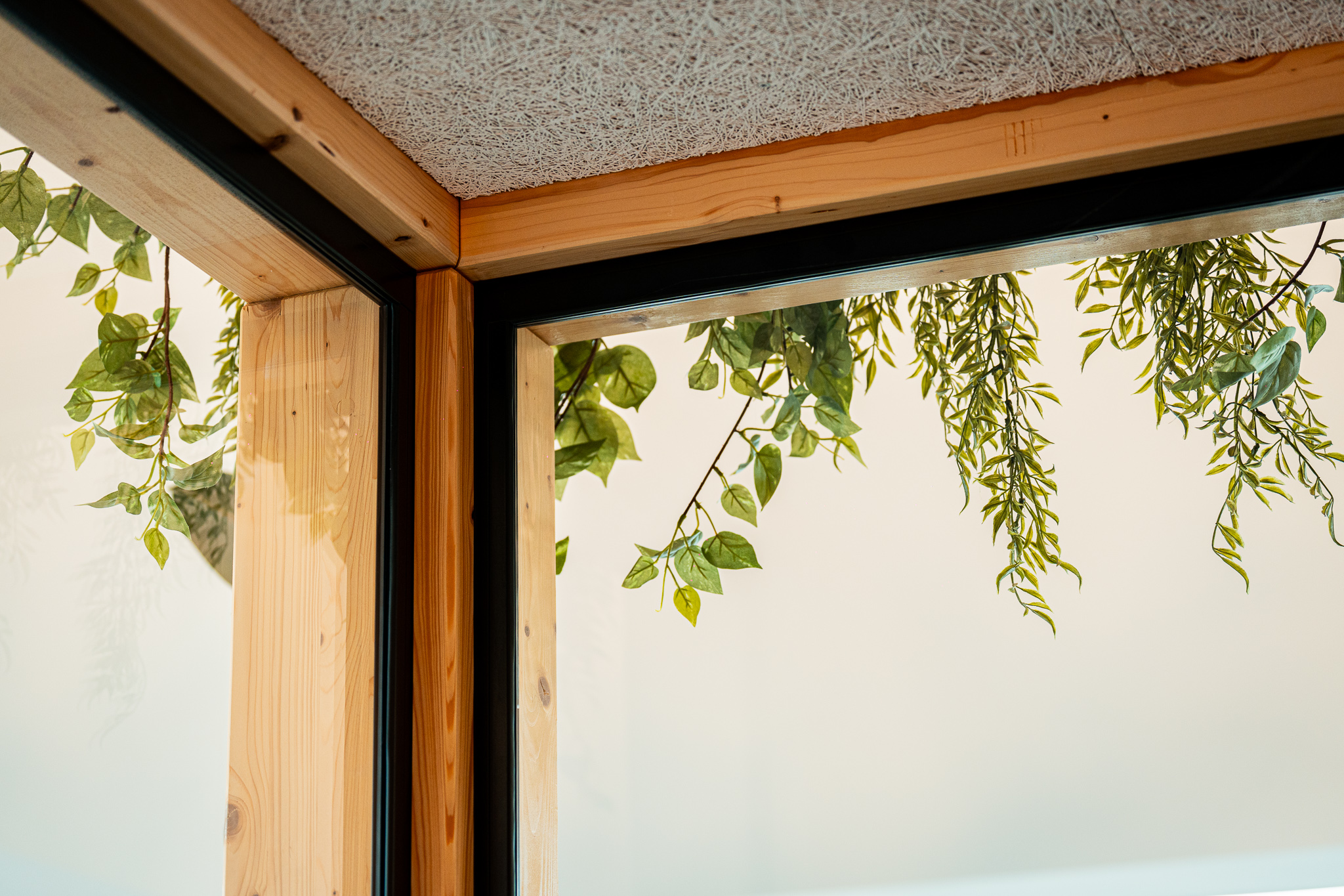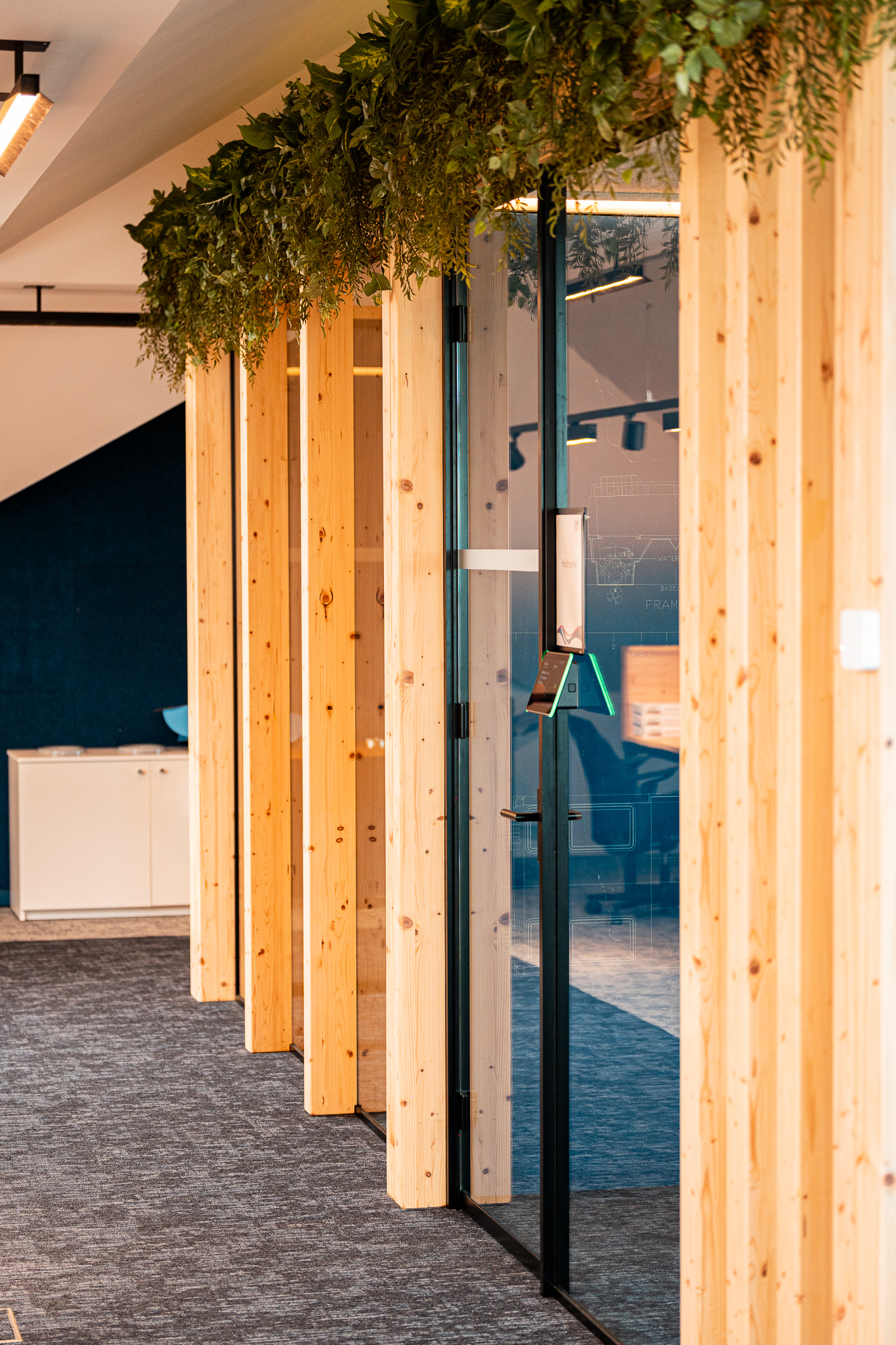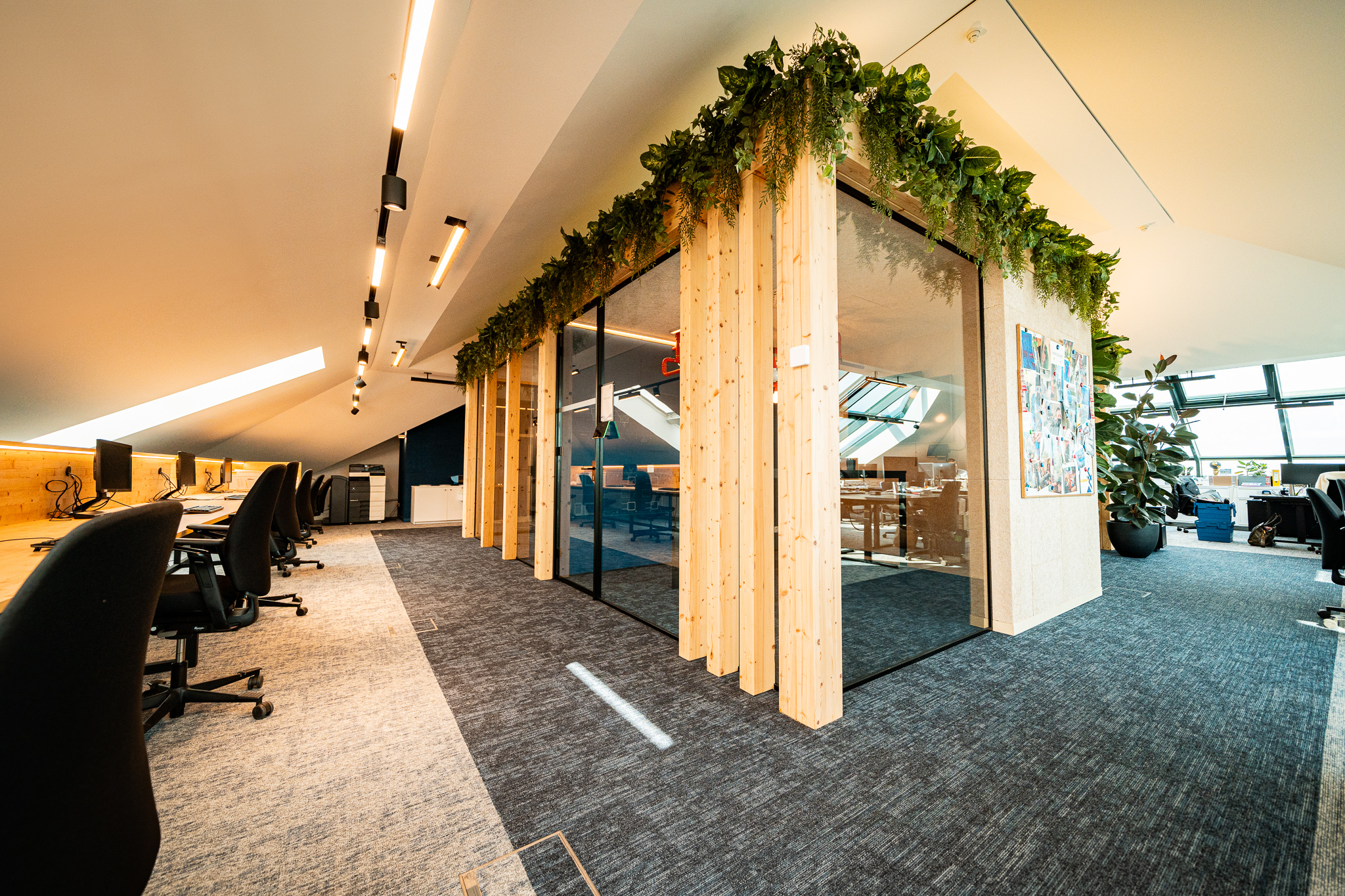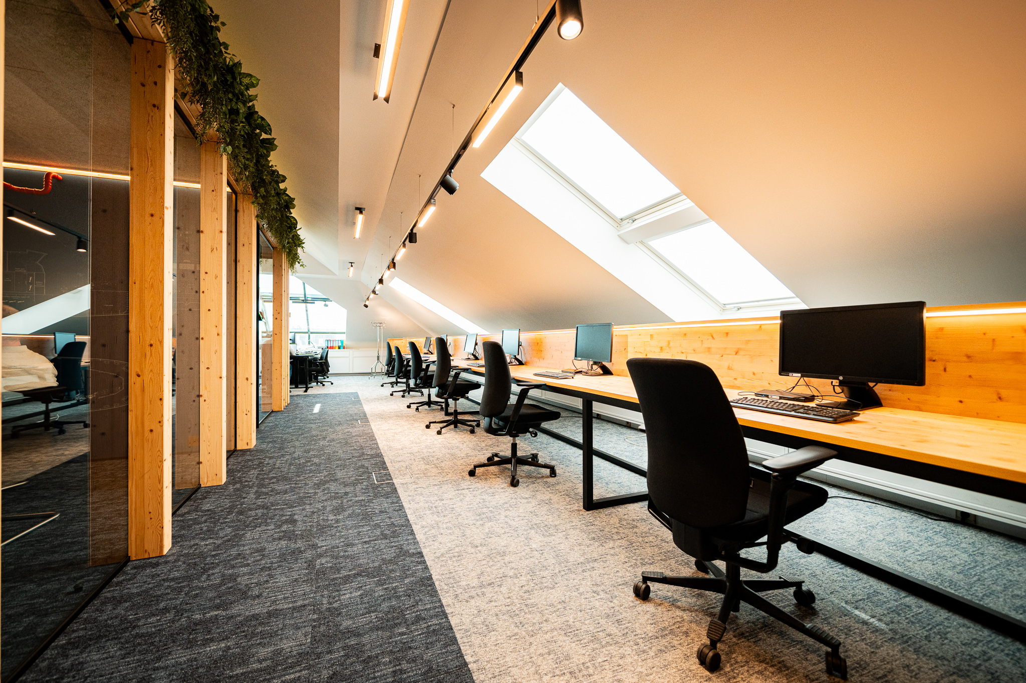 In deze kantoorinrichting werd een krachtig middenvolume ontworpen dat de vergaderruimtes bundelt en tegelijk structuur geeft aan het geheel. De constructie met massieve balken in combinatie met transparante glazen wanden creëert een architecturaal statement dat robuustheid en openheid harmonieus verenigt. Het volume fungeert als een centraal ankerpunt in het kantoor, zonder de ruimtelijkheid van de omgeving te doorbreken.