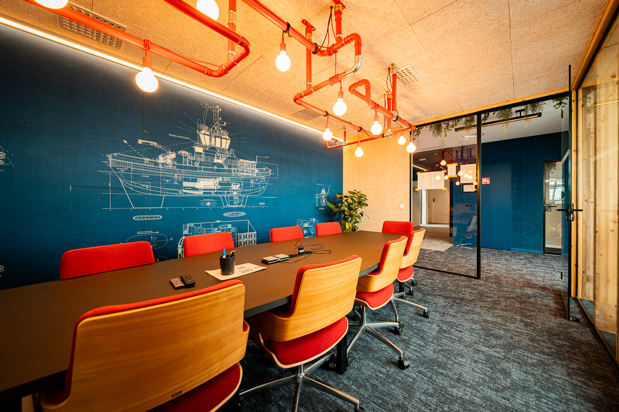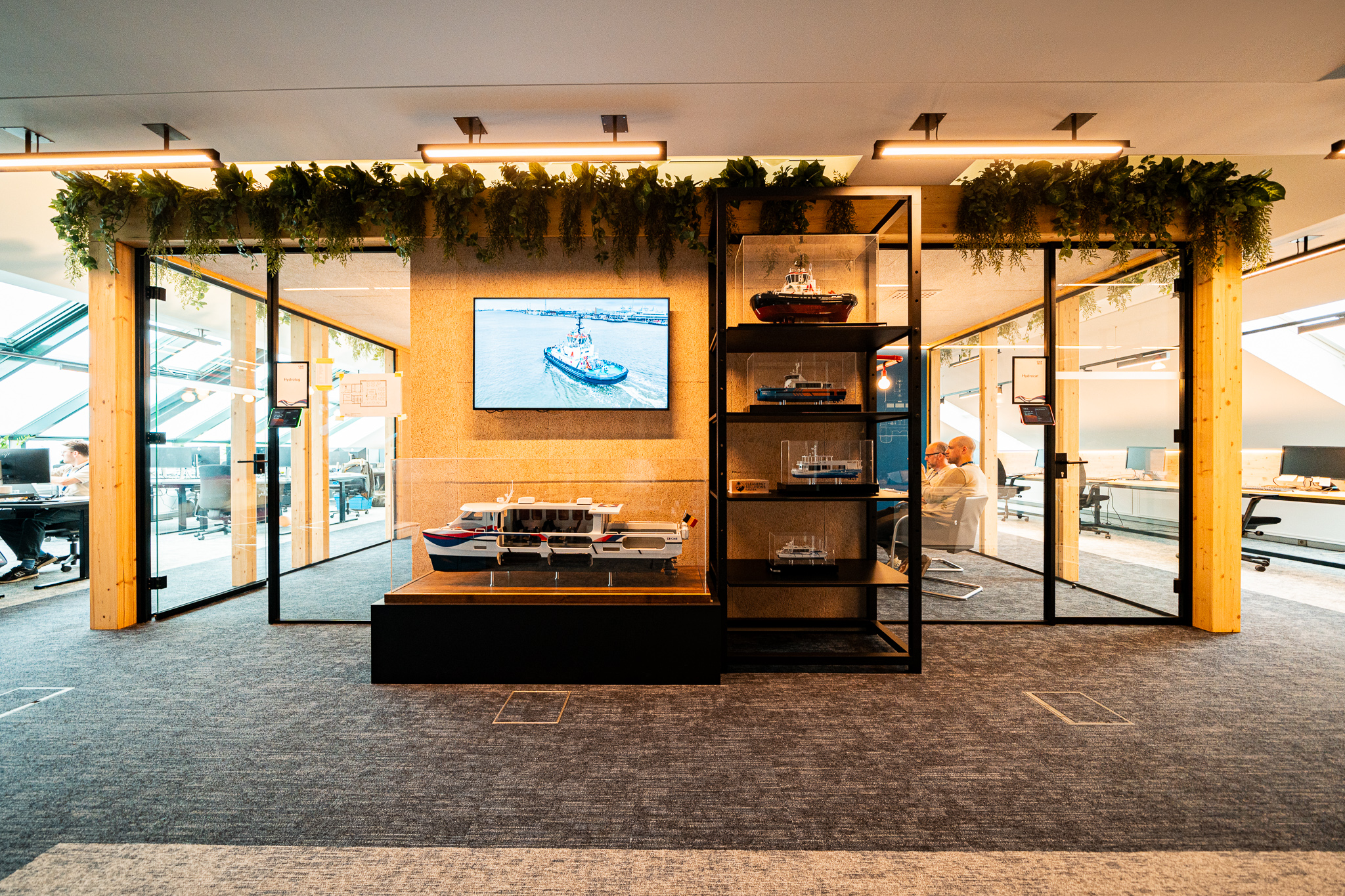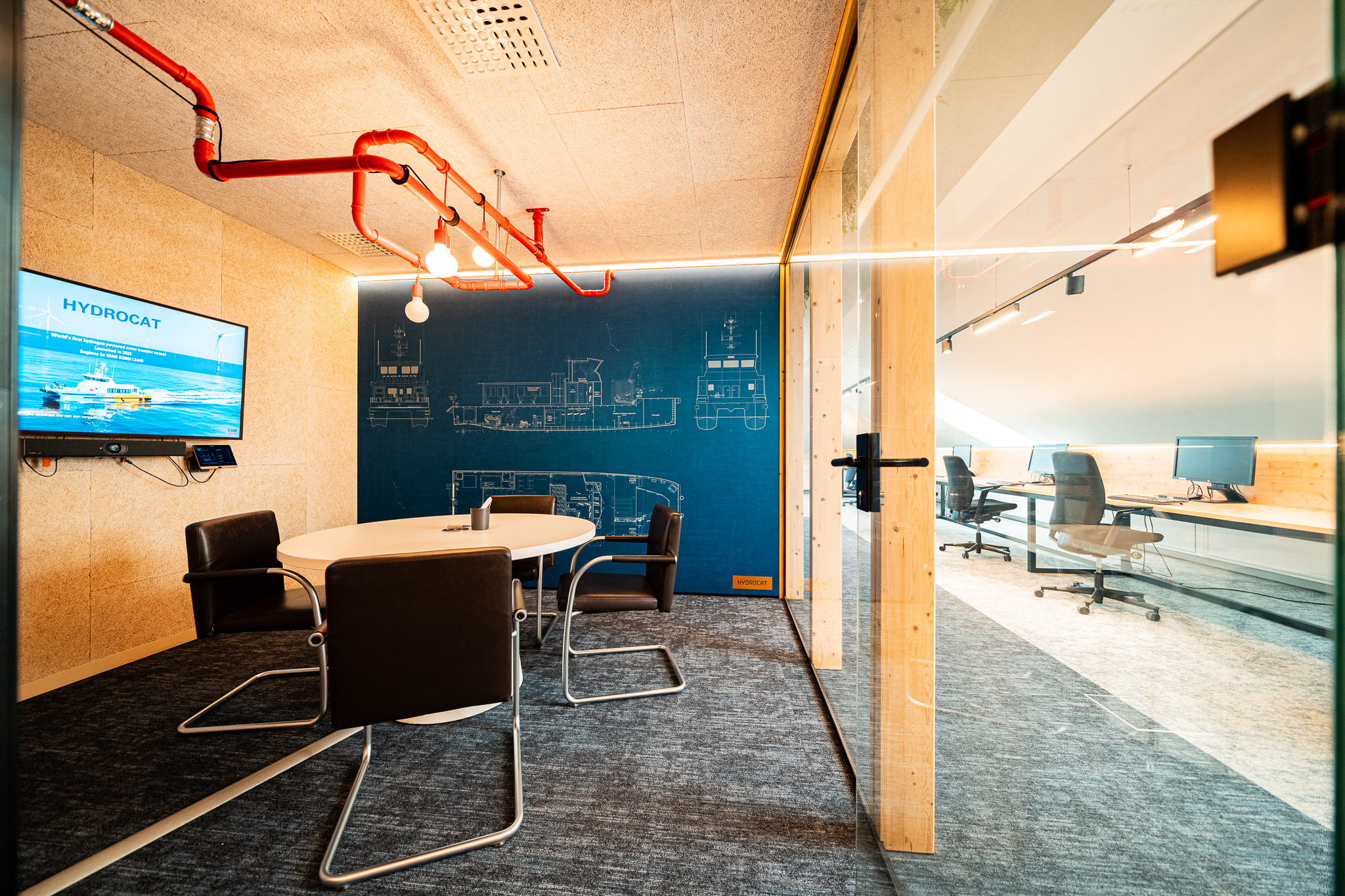 Ook het akoestisch comfort werd met zorg uitgewerkt. Hoogwaardige Organic.design-panelen zorgen voor een aangename geluidsbeleving, aangevuld met akoestische panelen waarop blueprints van schepen zijn verwerkt. Deze subtiele grafische elementen verwijzen naar de schepen die door de klant zelf worden ontworpen en gebouwd, en brengen zo de identiteit van het bedrijf op een verfijnde manier in het interieur.