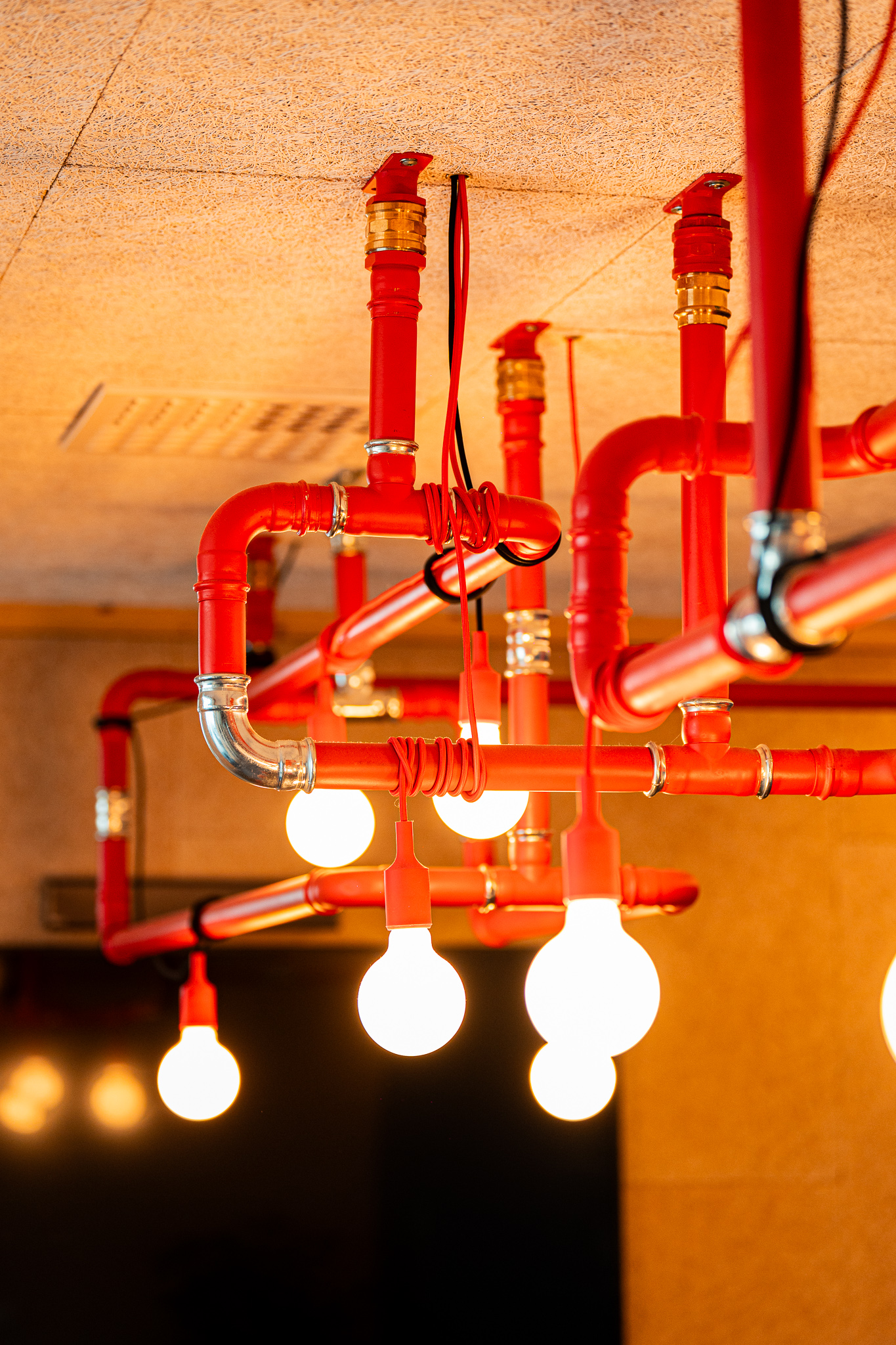 Het lichtconcept versterkt het industriële karakter van de onderneming. Een op maat vervaardigd buizenframe in staal vormt de basis van de verlichting en voegt een krachtige, industriële esthetiek toe aan het geheel. Zo ontstaat een werkomgeving waarin architectuur, materiaalgebruik en bedrijfsidentiteit naadloos samenvloeien.