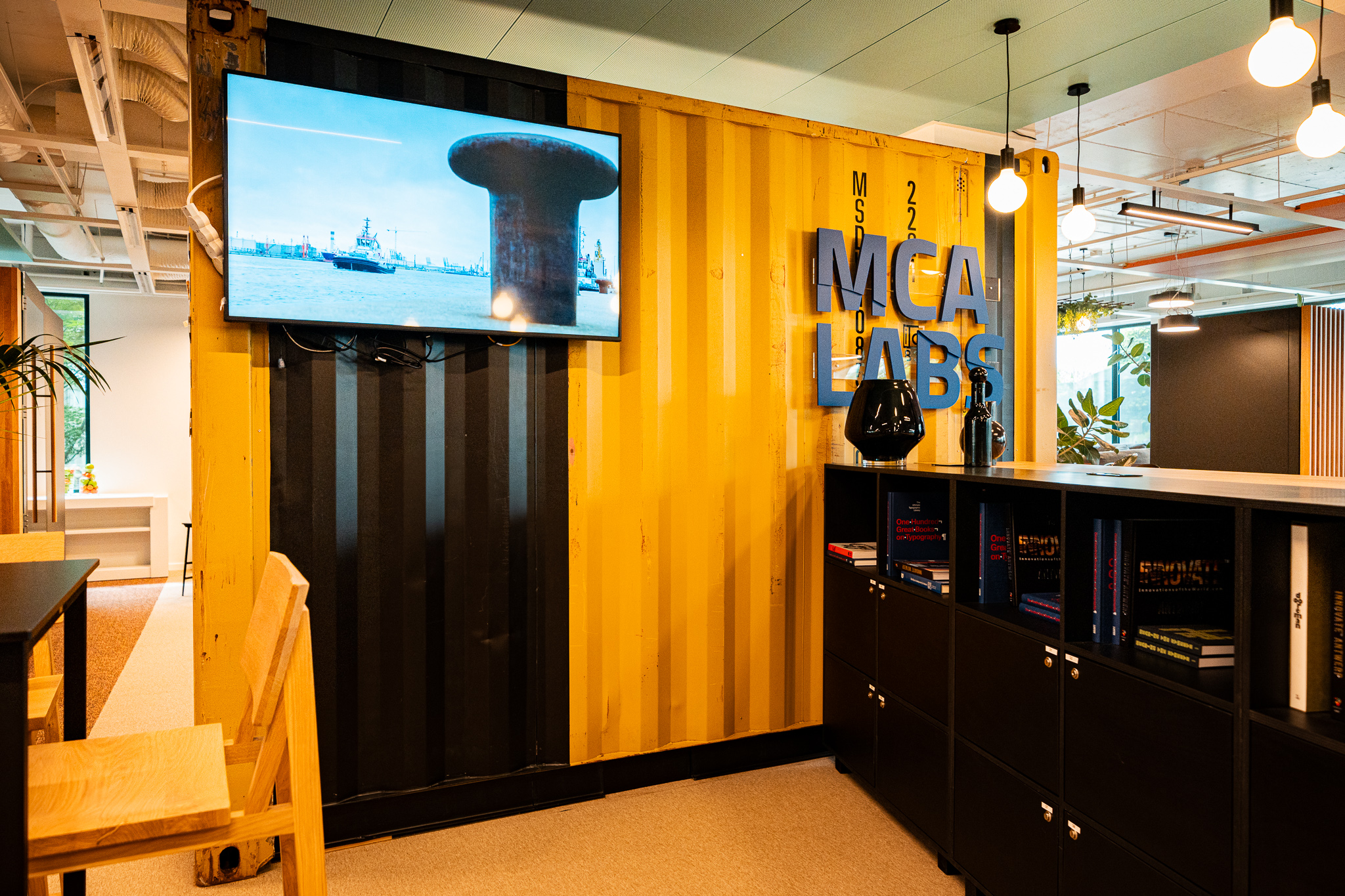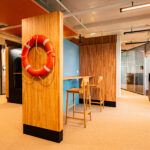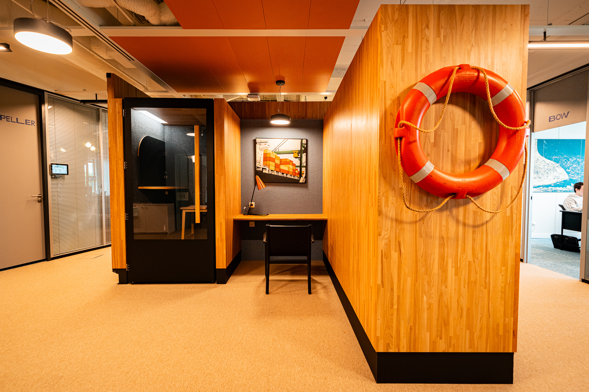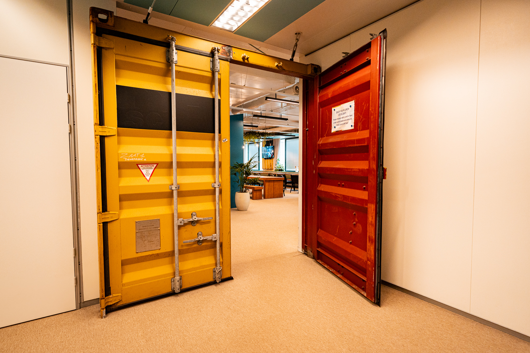 Aangezien de klant een Belgische rederij is, werden duidelijke maritieme accenten geïntegreerd in het ontwerp. Opengeslepen containers werden verwerkt tot decoratieve elementen, waarbij containerpanelen en containerdeuren een prominente plaats kregen in het interieur. Scheepstouwen en andere subtiele verwijzingen naar de scheepvaart versterken het speelse karakter van de ruimte. Het resultaat is een dynamische co-workingspace waar mensen samenkomen, samenwerken en ook kunnen ontspannen.