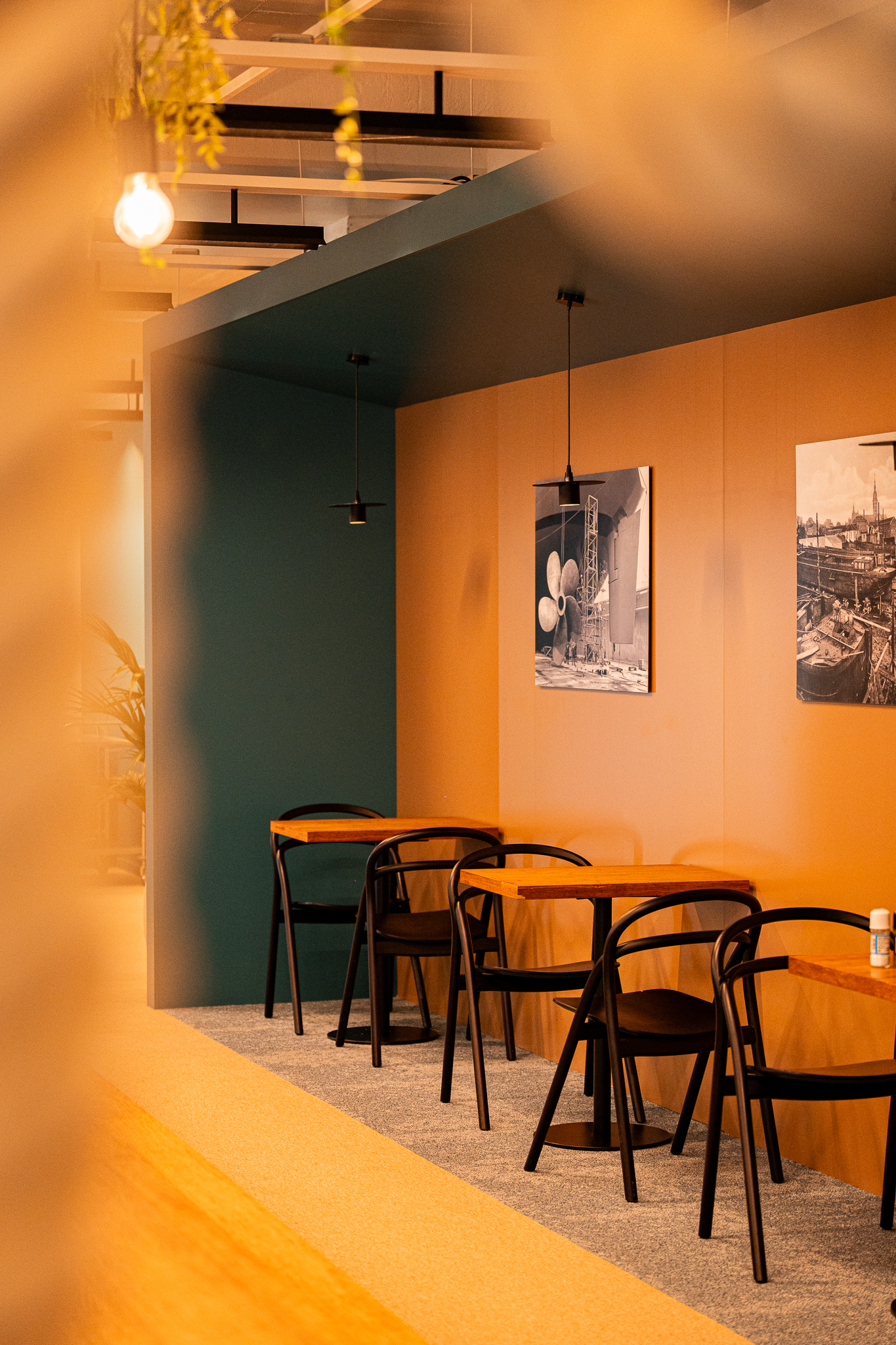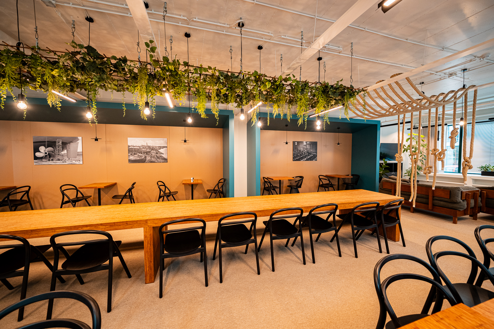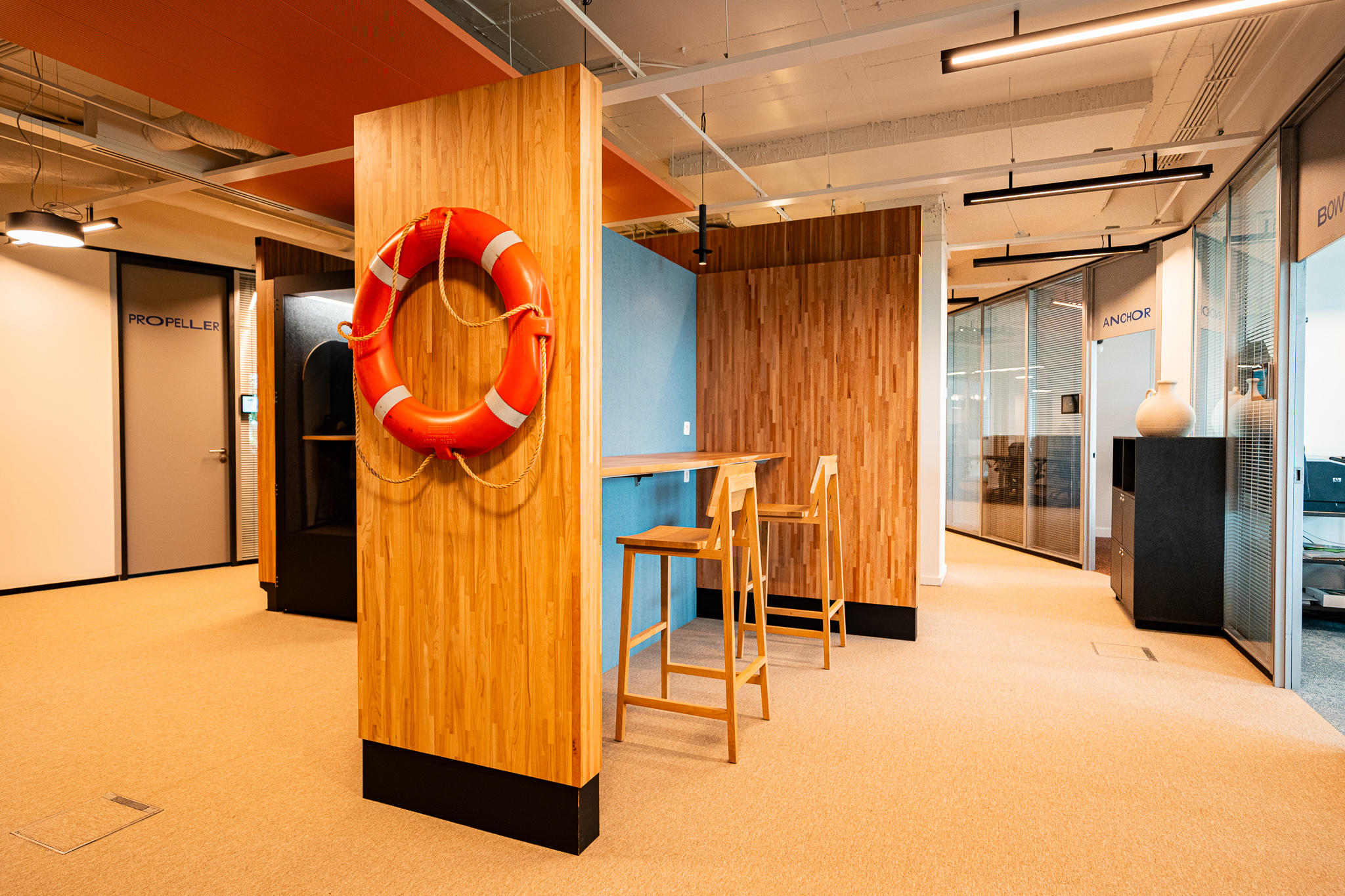 Aangezien de klant een Belgische rederij is, werden duidelijke maritieme accenten geïntegreerd in het ontwerp. Opengeslepen containers werden verwerkt tot decoratieve elementen, waarbij containerpanelen en containerdeuren een prominente plaats kregen in het interieur. Scheepstouwen en andere subtiele verwijzingen naar de scheepvaart versterken het speelse karakter van de ruimte. Het resultaat is een dynamische co-workingspace waar mensen samenkomen, samenwerken en ook kunnen ontspannen.