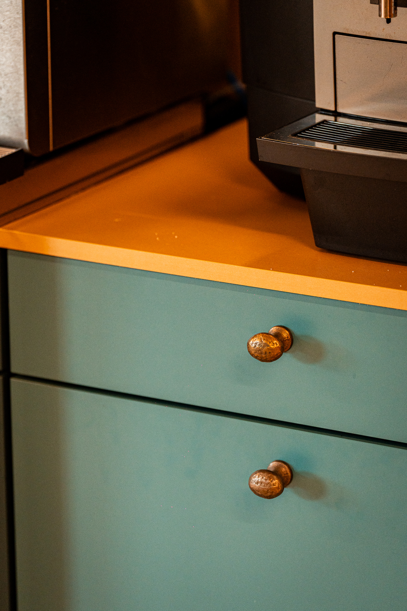 Deze kantoorinrichting toont hoe circulariteit en identiteit samen een uniek interieur kunnen vormen. Bestaande bureaubladen werden zorgvuldig verzaagd, geschuurd en opnieuw vernist, waarna ze een tweede leven kregen als wandbekleding en compartimenteringswanden. Zo werd niet alleen duurzaam gewerkt, maar kreeg het interieur ook een warme en authentieke uitstraling.